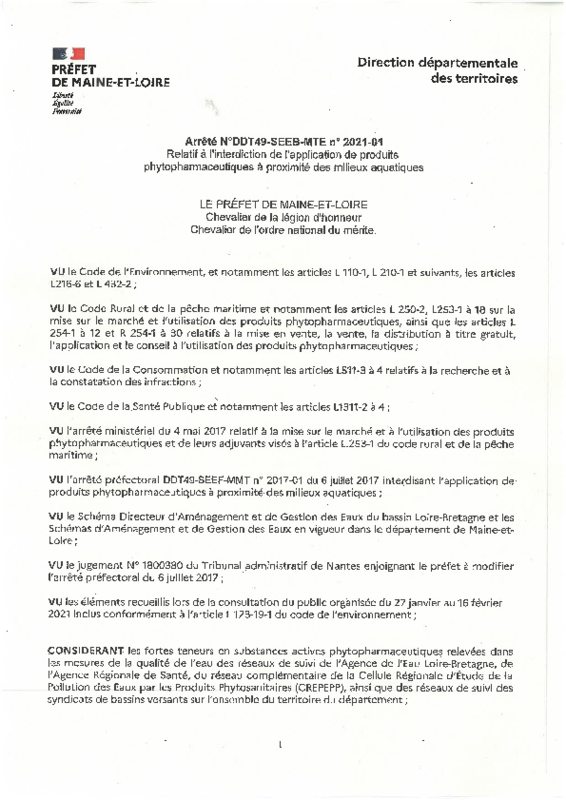 Les Préfets des quatre départements du territoire ont pris des mesures visant à restreindre et interdire l'utilisation de pesticides sur certains espaces. Ainsi quatre arrêtés préfectoraux encadrent l'application de produits phytosanitaires à proximité des milieux aquatiques : cette réglementation concerne tout utilisateur de pesticides.