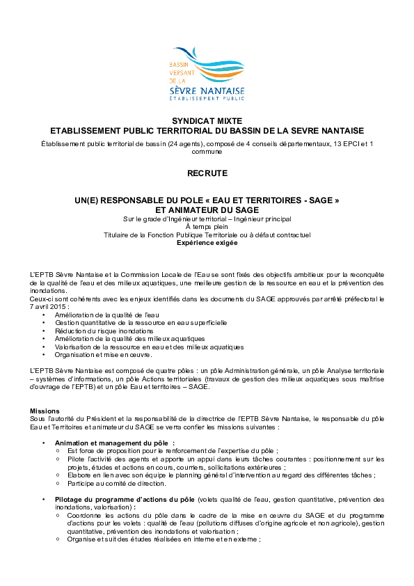 UN(E) RESPONSABLE DU POLE « EAU ET TERRITOIRES - SAGE »